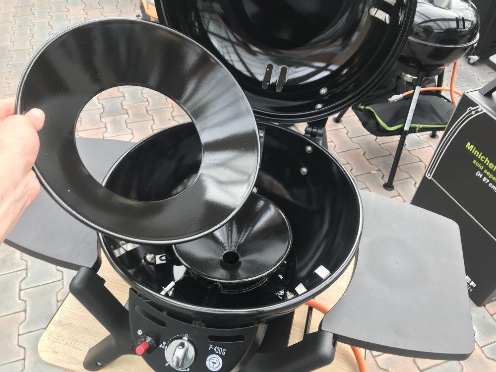 Gril se nastavuje na přímé grilování v případě, když chcete zatáhnout steak či zprudka ogrilovat zeleninu. Horní část trychtýře otočte vzhůru nohama. Žár z hořáku bude proudit úzkým otvorem uprostřed. Koncertovaný žár díky nastavení trychtýře dosahuje uprostřed roštu až 500°C. Až bude maso hotové, můžete přesunout více ke straně, mimo působení žáru.
