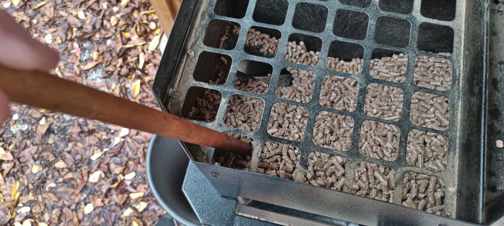 Jakmile začnou pelety padat do kbelíku, stačí se ujistit, že do kbelíku padají všechny pelety. Spadlé pelety mimo již nepoužívejte. Mohlo již dojít ke kontaminaci vlhkostí případně nečistotami které můžou poškodit Váš gril nebo znehodnotit i ostatní pelety.