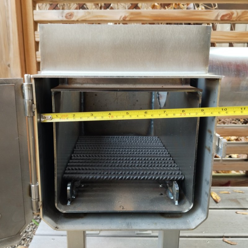 Masivní dubová udírna o objemu 710l s nerezovým bočním topeništěm, nerezovou střechou a plynulou regulací kouře.
