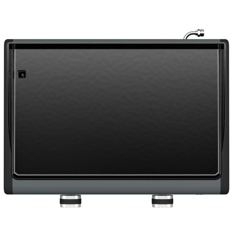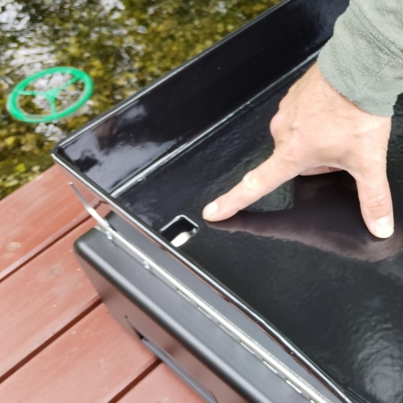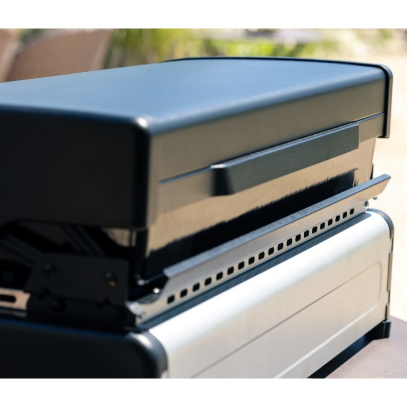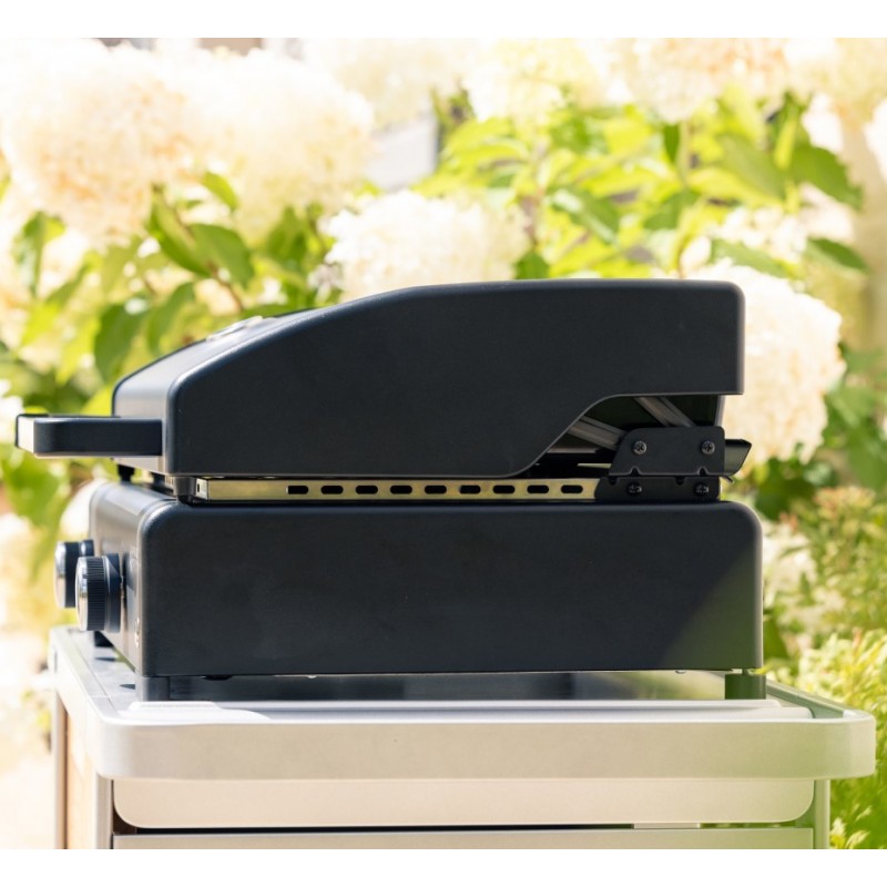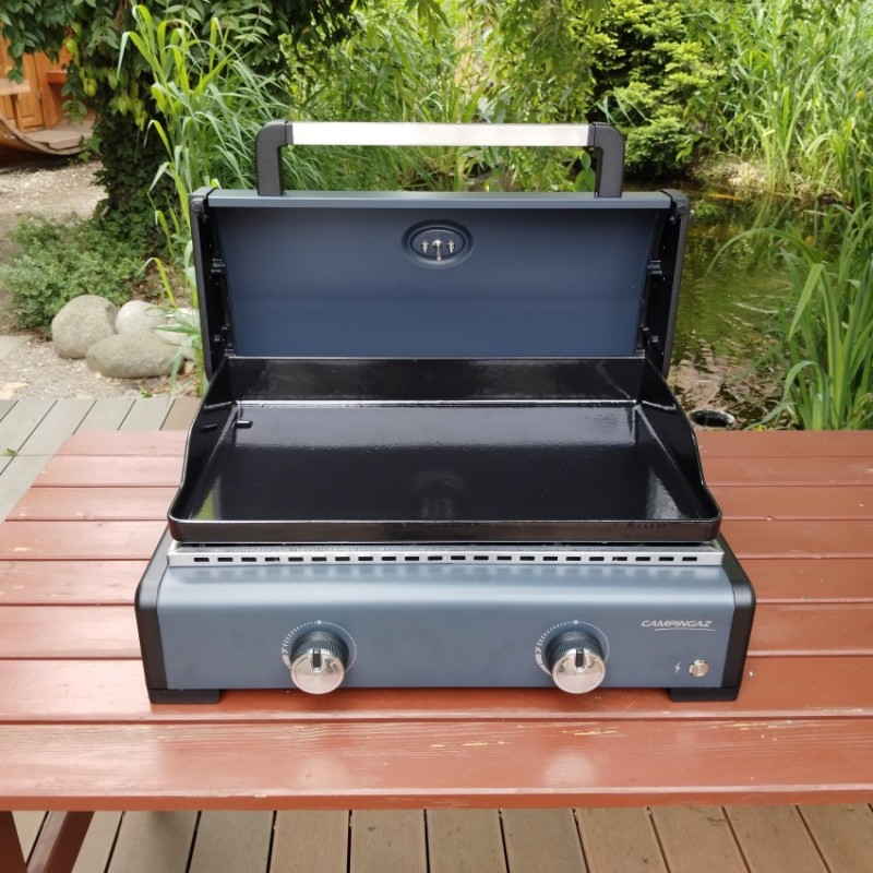Stolní plynový gril s hladkou grilovací plochou ze smaltované litiny a grilovacím víkem