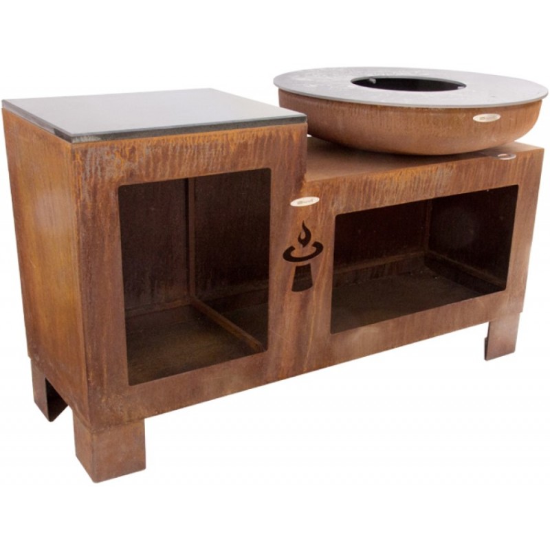 Velké venkovní ohniště a gril s ocelovou plotnou a zásobníkem na dřevo moderního rezavého vzhledu.