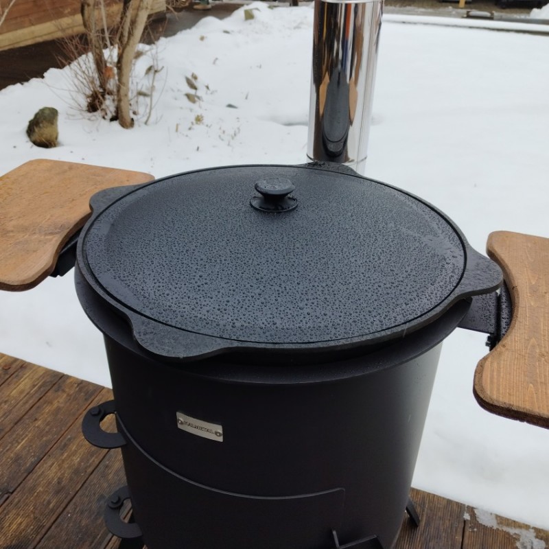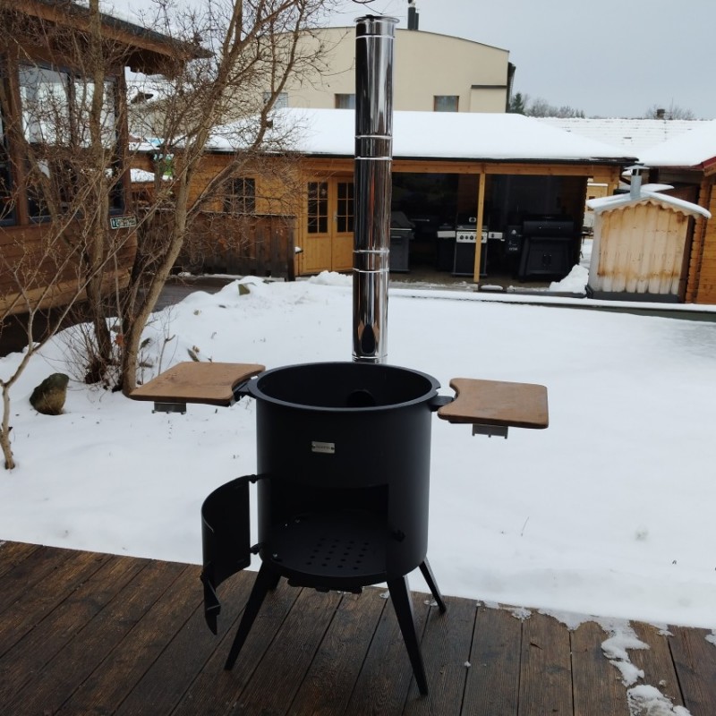 Kotlíkové ohniště PREMIUM s komínem, průměr ohniště na kotlík 50cm + kotlík 50cm/22L, ocelové dvojité dno, 2x boční police.