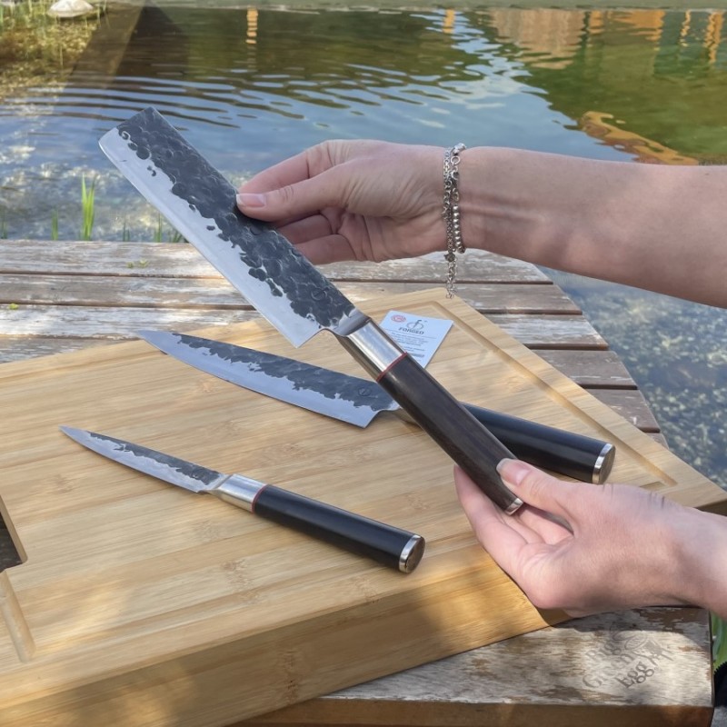 Luxusní sada FORGED Sebra obsahuje tři ručně kované nože - kuchařský nůž, japonský nůž na zeleninu a univerzální nůž s kratší čepelí