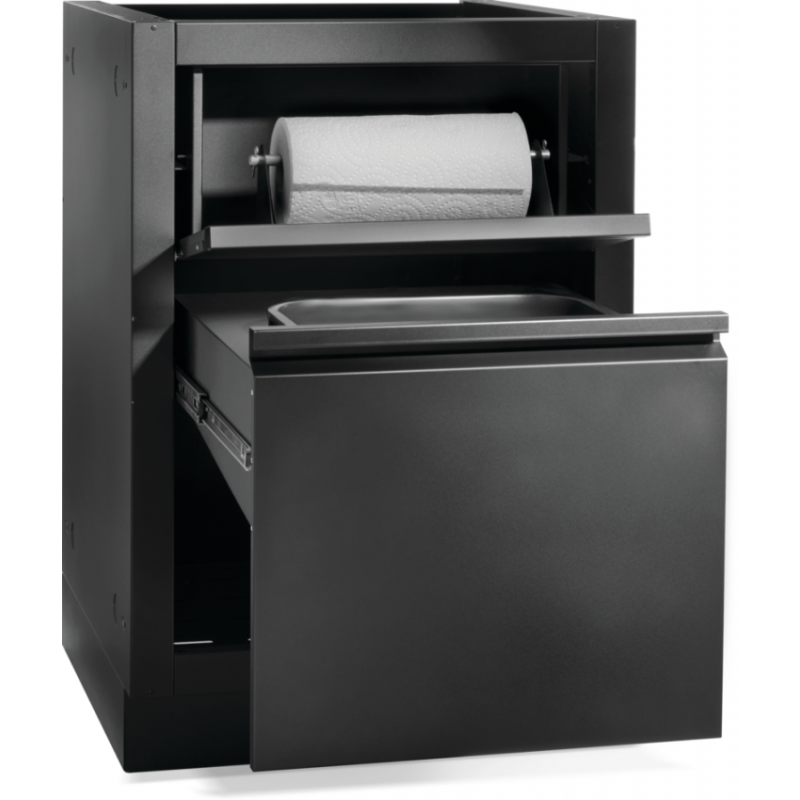 Skříň venkovní kuchyně se zásuvkou pro odpadkový koš Napoleon Phantom přináší do sestavy OASIS™ pořádek, hygienu a maximální komfort při grilování. Promyšlené řešení s výsuvným košem umožňuje snadnou likvidaci odpadu přímo u pracovní plochy, bez nutnosti odbíhat od grilu. Výklopná zásuvka s integrovaným držákem papírových utěrek zvyšuje praktičnost při přípravě jídla. Celá skříň je navržena tak, aby perfektně ladila s ostatními moduly Phantom a dlouhodobě odolávala venkovním podmínkám.