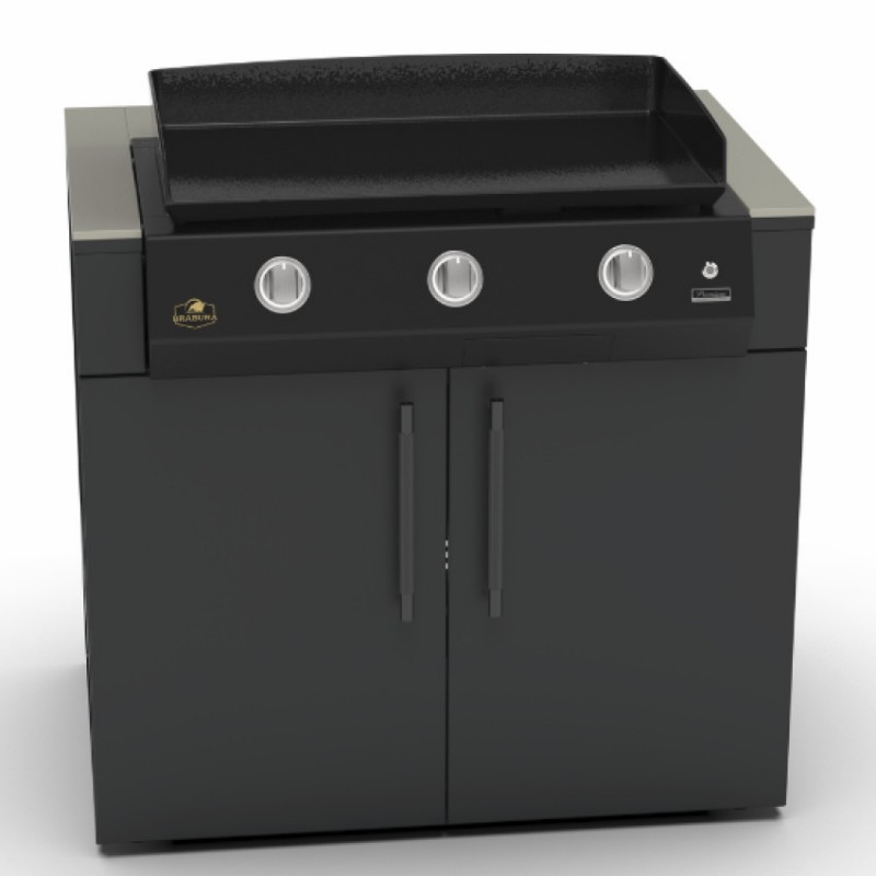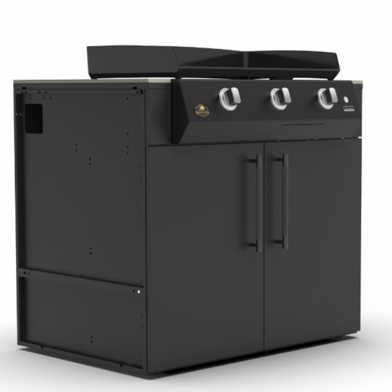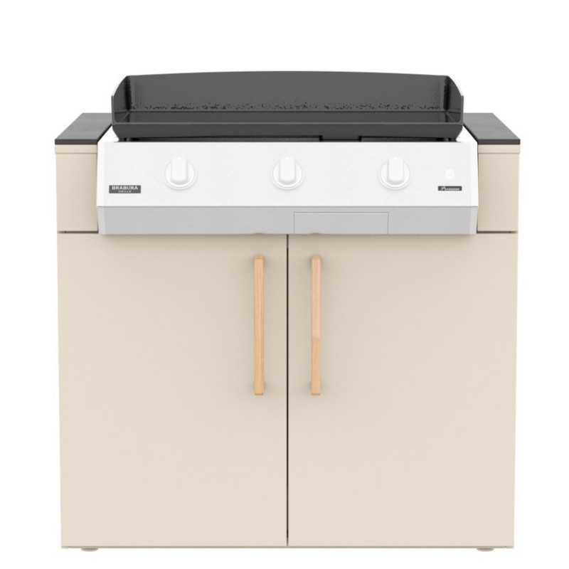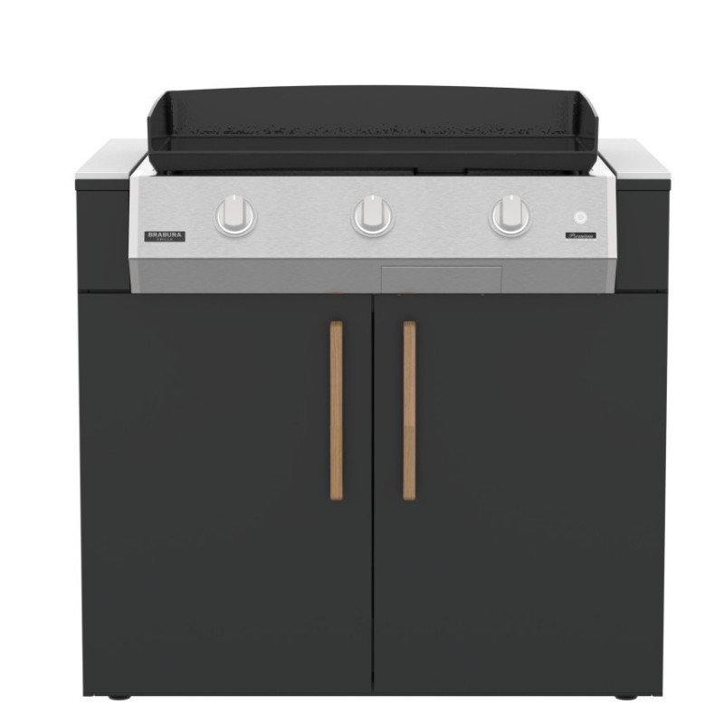 Skříňka Brabura KC 100 Plancha umožňuje plnohodnotné zabudování planchy do designové venkovní kuchyně bez kompromisů v designu či stabilitě. Integrovaný prostor pro plynovou láhev udržuje sestavu čistou a vizuálně sjednocenou.