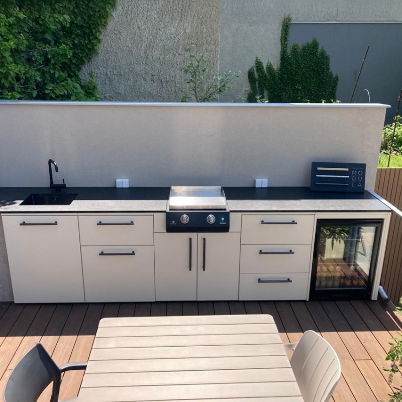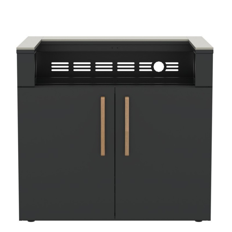 Konstrukce z nerezové oceli s práškovým lakováním Qualicoat je navržena pro dlouhodobé venkovní použití a vysokou odolnost proti korozi. Pracovní deska z keramického materiálu Neolith dodává modulu moderní vzhled a zároveň mimořádnou odolnost proti teplu, poškrábání i skvrnám.