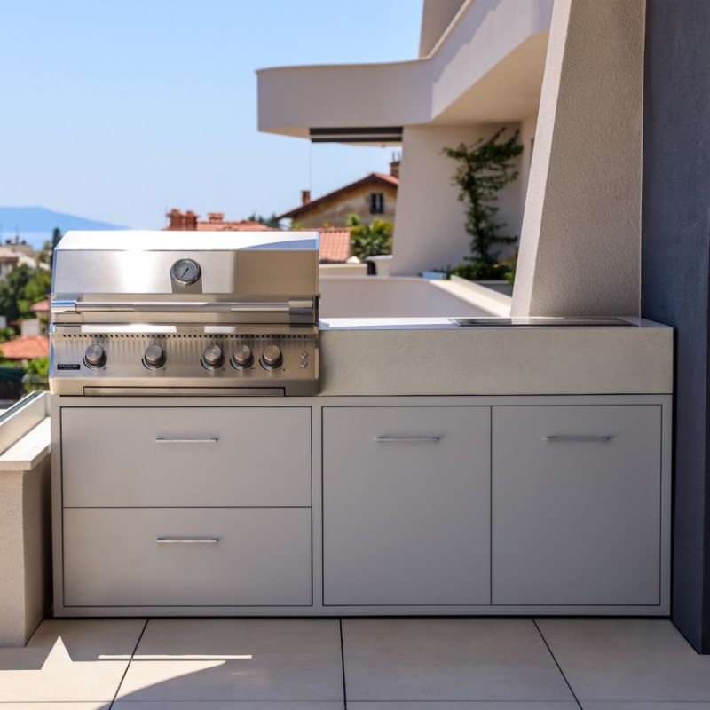 Konstrukce z práškově lakované nerezové oceli s certifikací Qualicoat je navržena pro dlouhodobé venkovní používání a vysokou odolnost proti korozi. Pracovní deska z keramického materiálu Neolith dodává modulu luxusní vzhled a zároveň výjimečnou odolnost proti teplu, poškrábání i skvrnám.