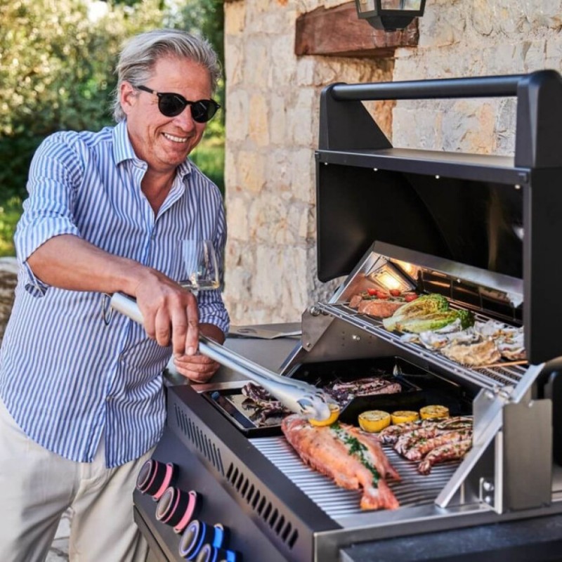 | Základní vybavení | nerezový rošt, teploměr s ciferníkem, 4 nerezové hořáky, 1 zadní hořák, zapalování JET FIRE, ohřívací rošt, podsvícené knoflíky, elektrický otočný rožeň, boční plotýnka SIZZLE ZONE, zásuvka na odpadkový koš, dvě zásuvky na příslušenství, skříňka na držák papírových utěrek a skříňka na uložení PB láhve |