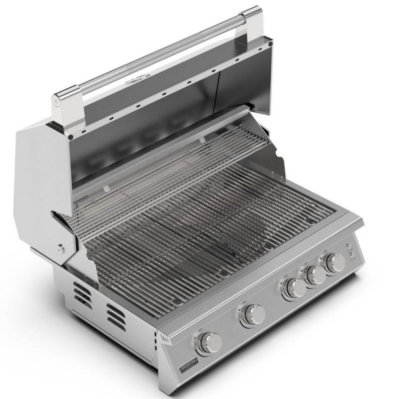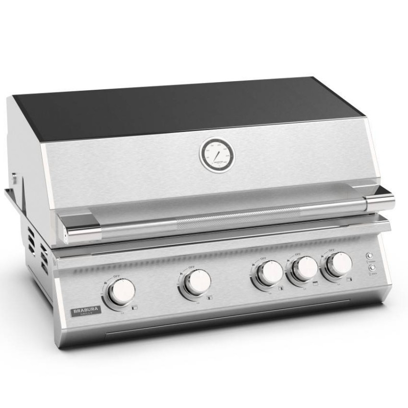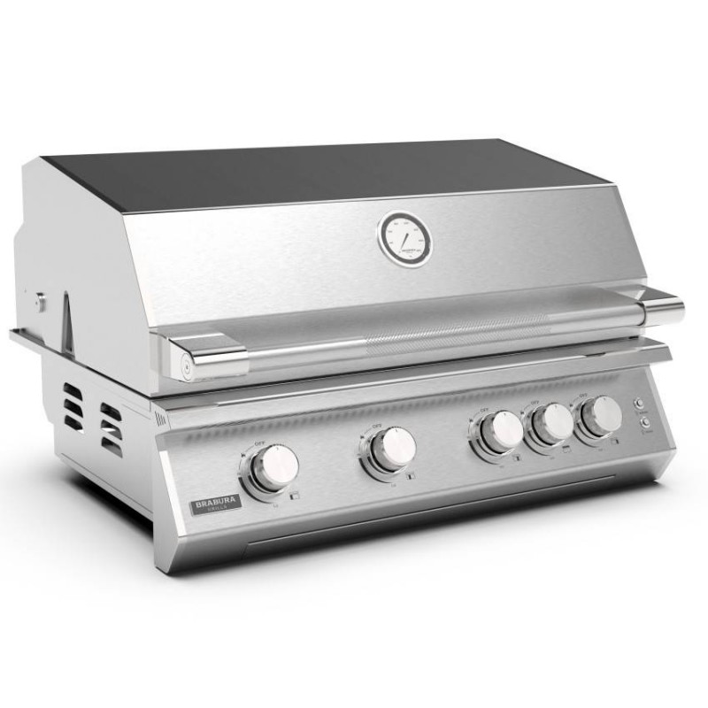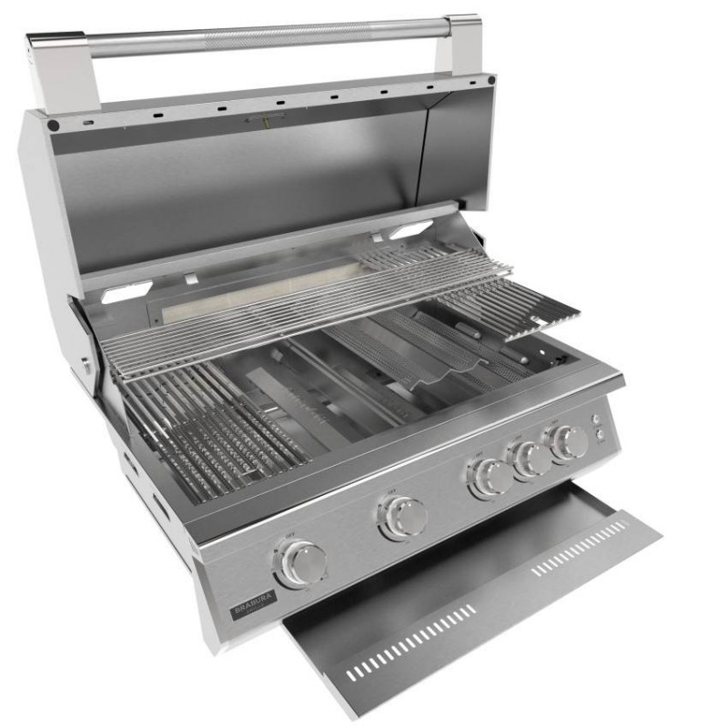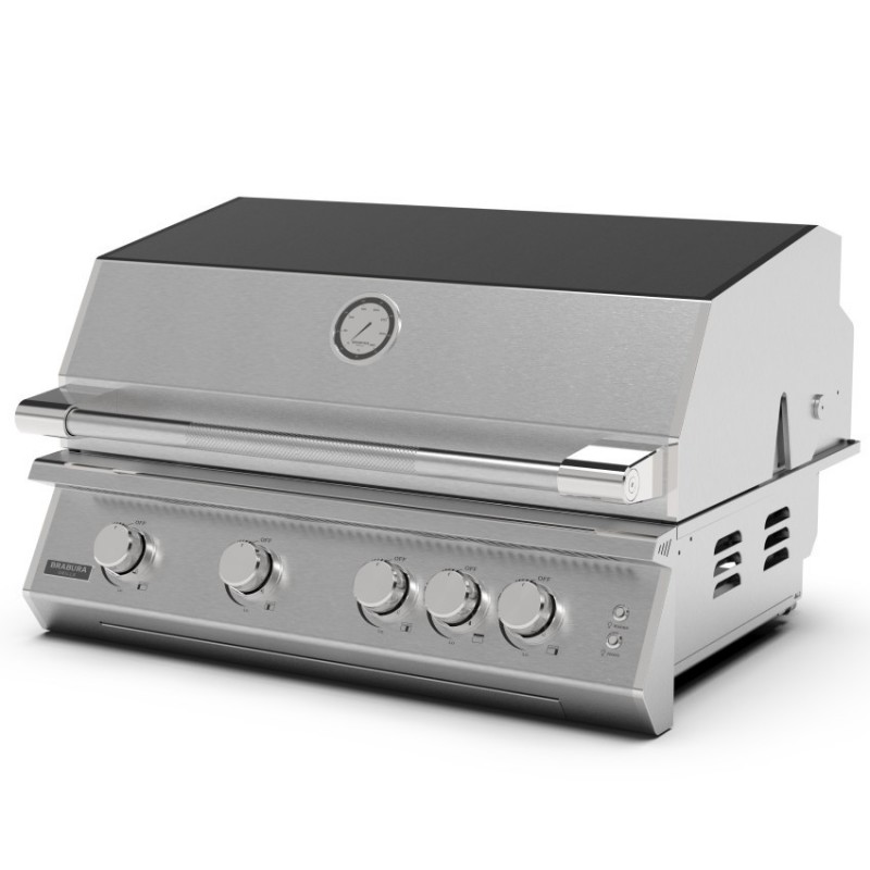 Brabura Fusion 400 Stainless Steel je vestavný plynový gril se 4 hořáky, infra zadním hořákem, 8mm nerezovými rošty a výkonem 19,05 kW pro profesionální venkovní kuchyni.