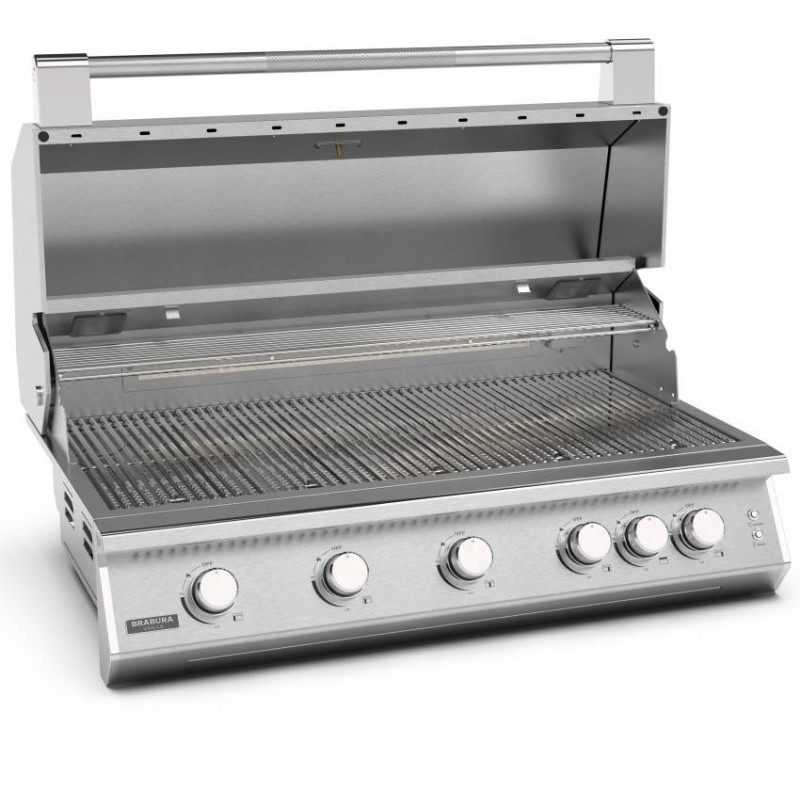 Brabura Fusion 500 Stainless Steel je vestavný plynový gril s 5 hořáky, infra zadním hořákem, výkonem 22,86 kW a masivními nerezovými rošty pro profesionální venkovní kuchyně.