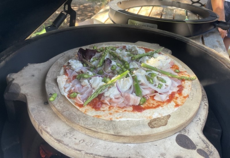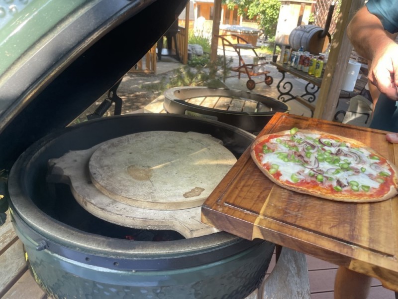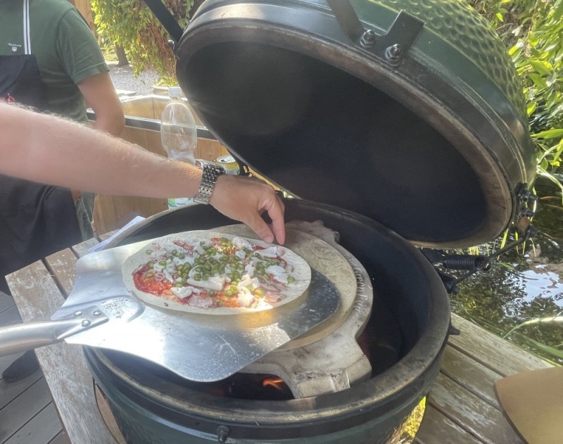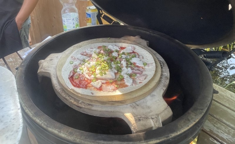 - Položte pizza kámen na rošt grilu a gril předehřejte na 250 – 275 °C