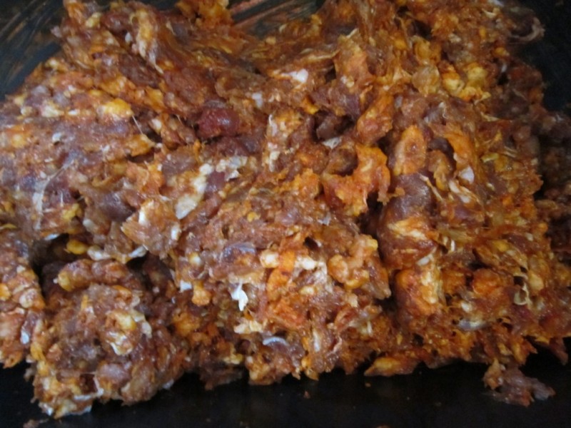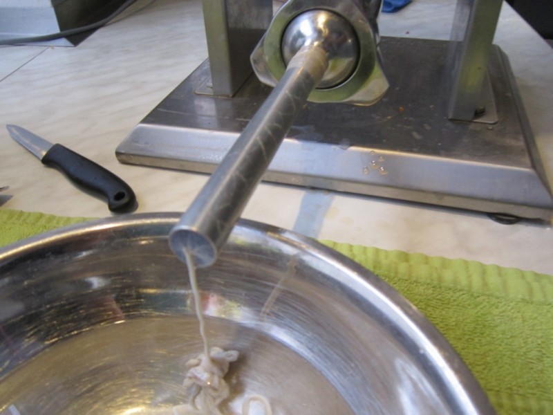 - Poté ochucenou směs narazíme do připravených skopových střívek.