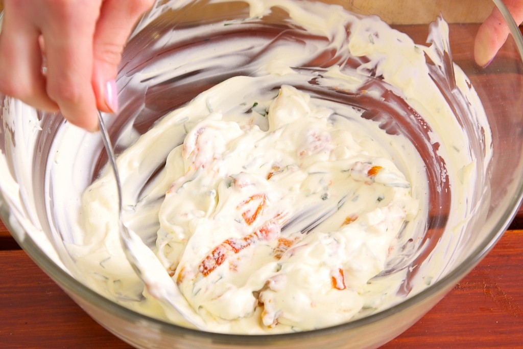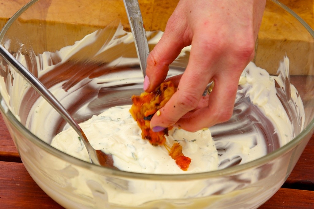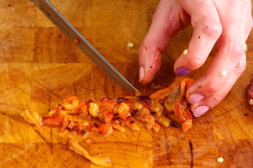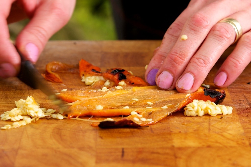 Postup: papriky ogrilujeme nad přímým středním žárem přibližně 12 - 16 minut dokud slupka nezčerná. Papriky průběžně otáčíme. Hotové přeneseme do misky a necháme vychladnout. Opatrně odstraníme tenkou slupku a semínka, měkkou dužinu nakrájíme na malé kousky a vmícháme k ostatním surovinám. V chladu necháme odležet alespoň 20 minut. Omáčka je vhodná ke všem druhům masa včetně zeleniny.