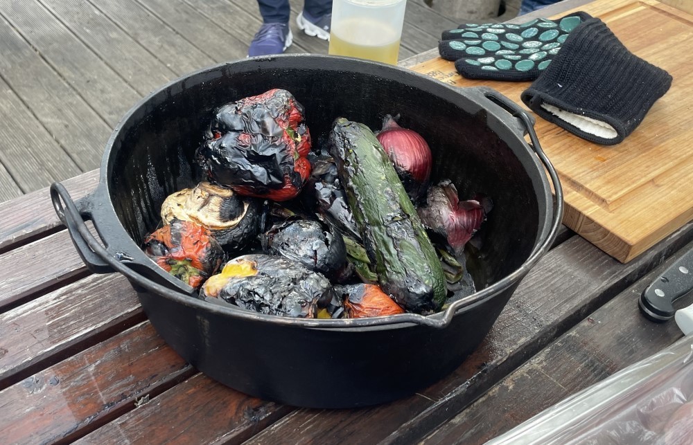 Grilované vepřové kotlety s pečenou zeleninou v ohni