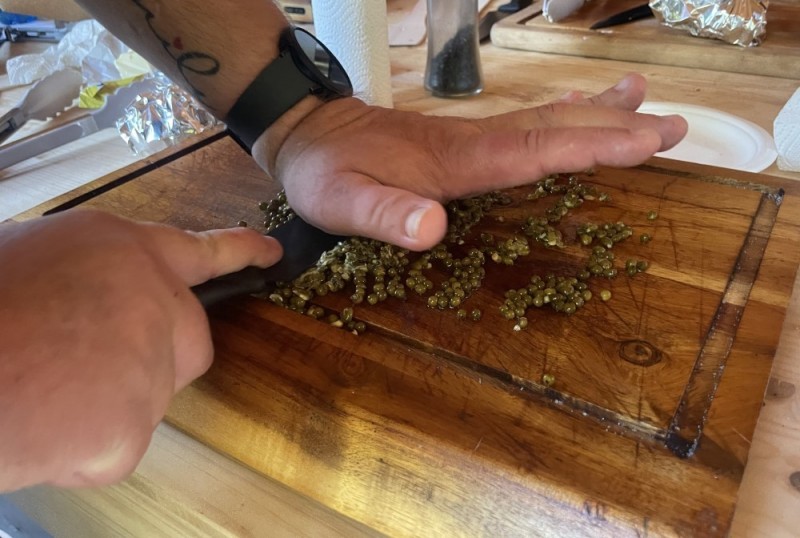 - Přidáme nožem rozmačkaný a nadrcený pepř a lehce orestujeme, aby se rozvoněl. To trvá 1 – 2 minuty.