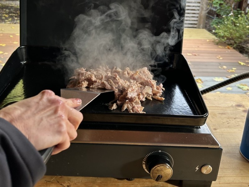 - Poté maso vyndáme, natrháme a necháme lehce orestovat na pánvi nebo planche