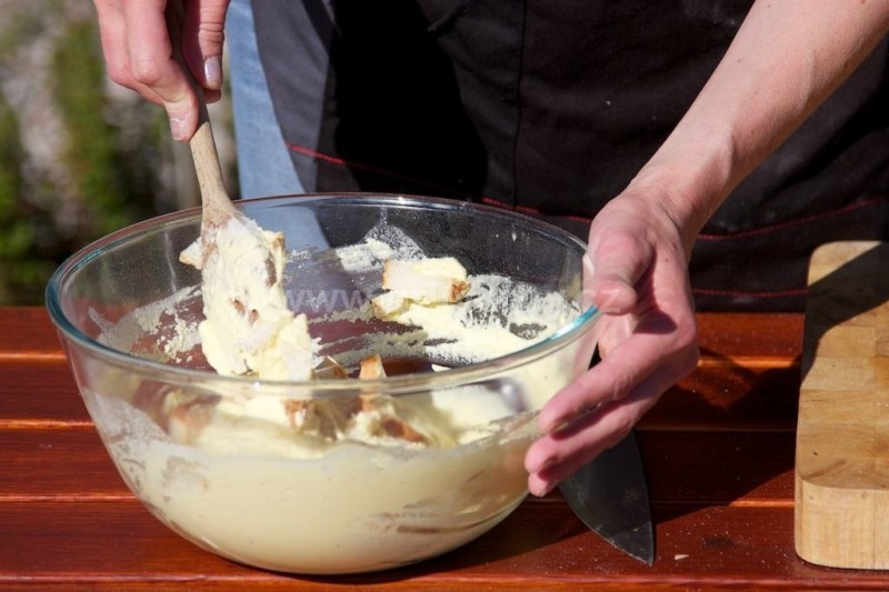 - V míse smícháme osolenou mouku smíchanou s práškem do pečiva s mlékem a vejci, přidáme na kostičky nakrájené rohlíky a vypracujeme řidší těsto.