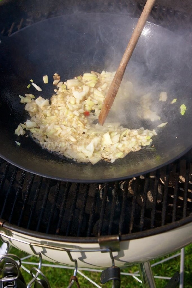 - Wok pánev vložíme do středu grilu a naplníme ji zpola horkou vodou, kterou uvedeme do varu.