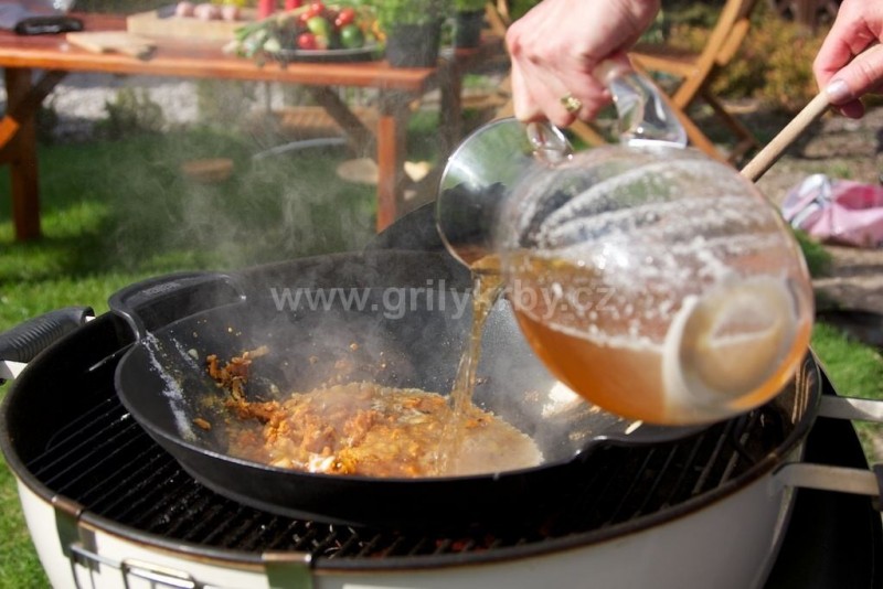 - Vložíme do rozpáleného grilu a zvolna ze všech stran grilujeme dozlatova, maso nemusí být propečené, bude se ješte vařit v omáčce.