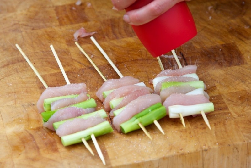 Máte chuť na něco lehkého a ne moc pracného? Potom jsou kuřecí špízy s jarní cibulkou a s omáčkou ze sladkého vína, sójovky, česneku a citrónové kůry přesně tím pravým pro vás.