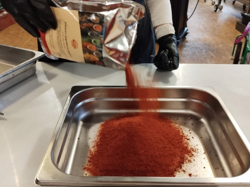- Přidáme směs Pikantní papriková klobása a sůl.