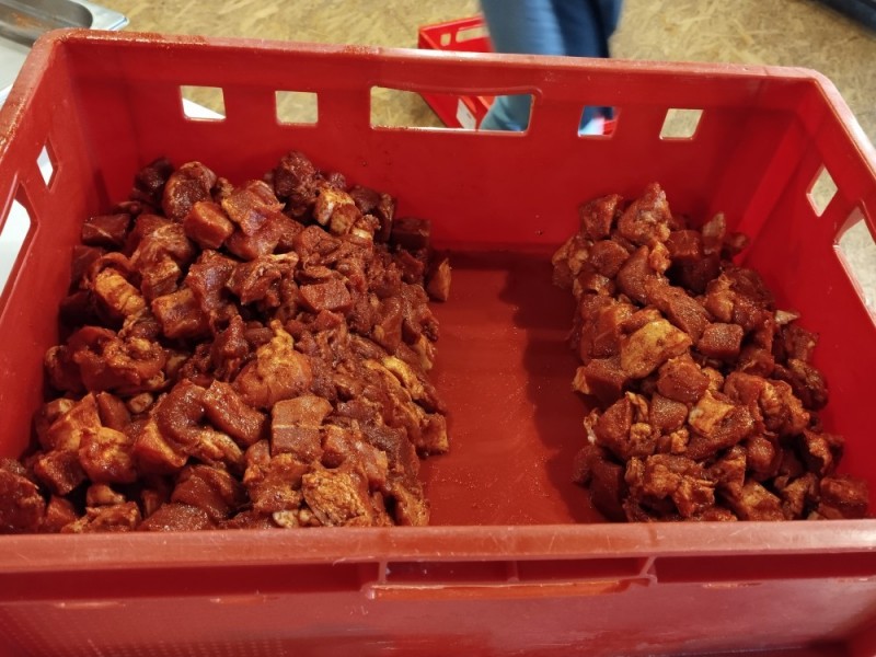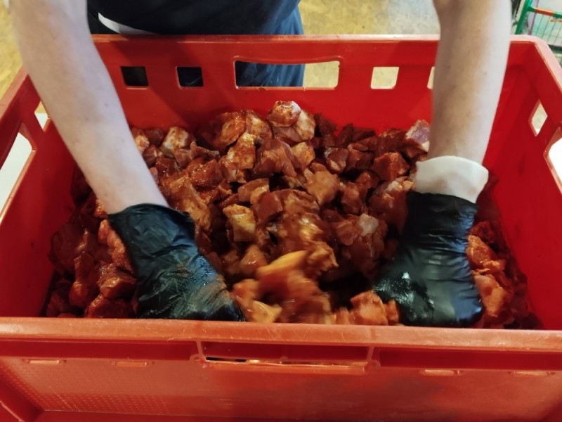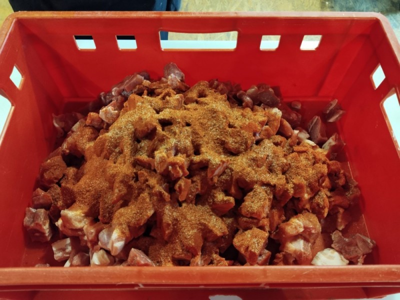 - Veškeré maso nakrájíme na kostky cca 4 x 4 cm a vložíme do nádoby vhodné pro míchání.
