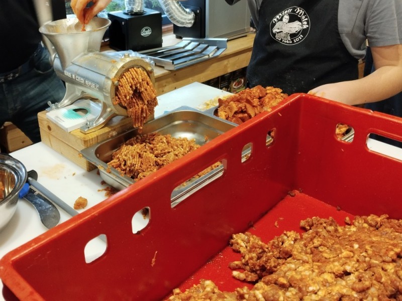 - Obě namleté části směsi důkladně promícháme a plníme do vepřových střev o průměru 32/34 mm