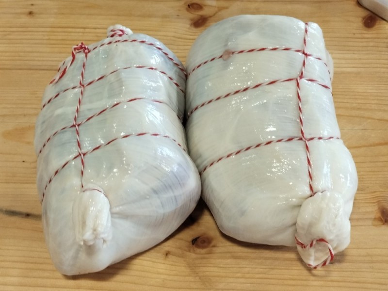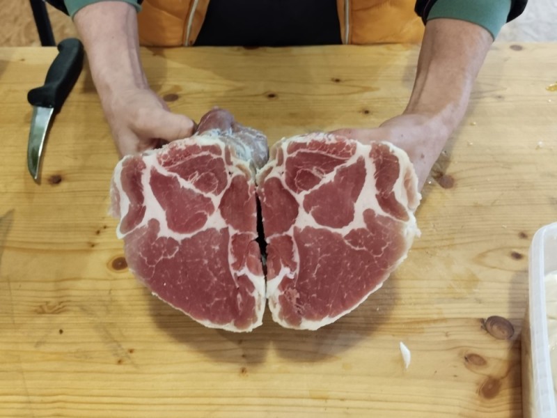 - Vepřovou krkovici rozřízneme na polovic a vložíme ji do předem namočeného hovězího deníku