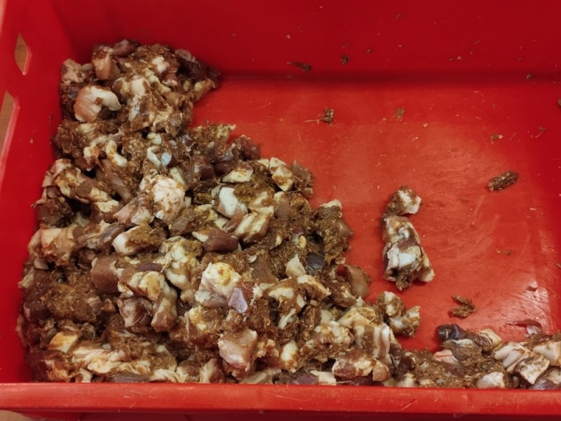 - Vepřové maso pokrájíme také na kostky 3 x 3 cm a nameleme na mlýnku s otvory 5 -10 mm