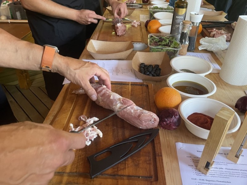 - Maso nakrájejte na plátky a podávejte s připraveným salátem.