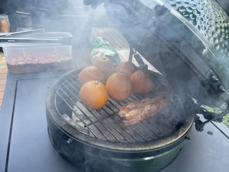 - Na vedlejší část roštu dejte předem oloupaný nebo napíchaný pomeranč, aby získal jemnou zakouřenou chuť.