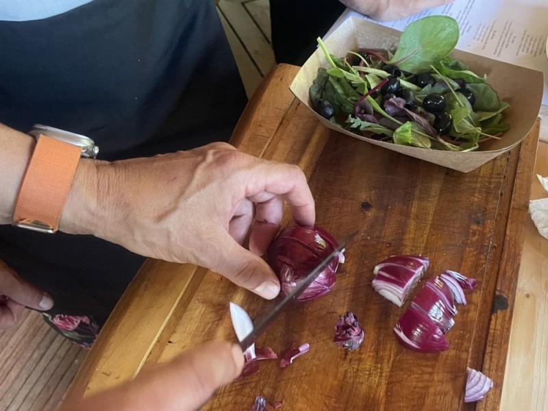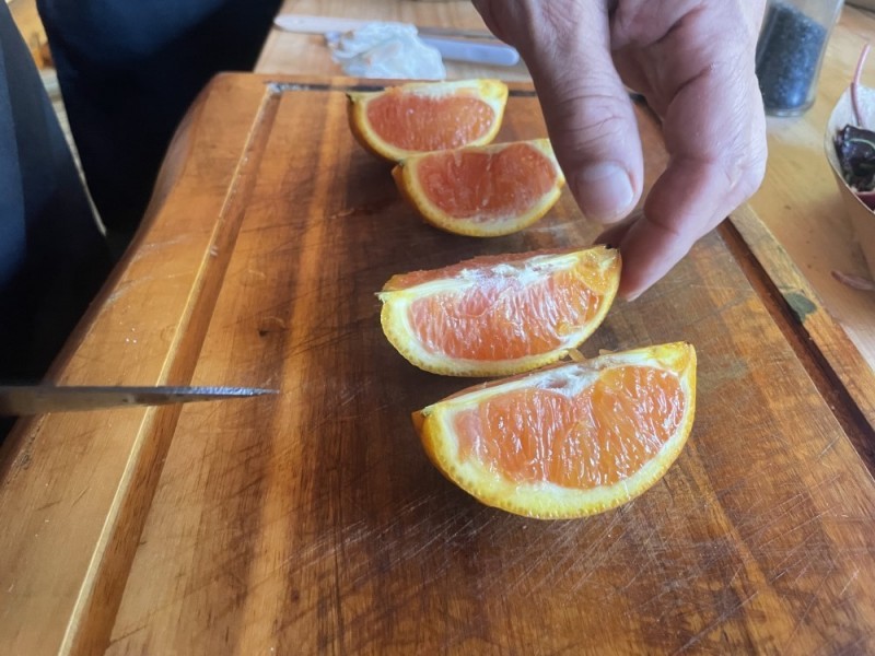 - V míse smíchejte mesclun salát, nakrájené olivy a zakouřený pomeranč.