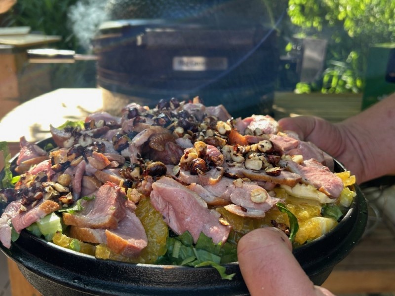 - Až bude z grilu cítit uzený kouř, vložíme kachní prsa přímo na rozpálený rošt