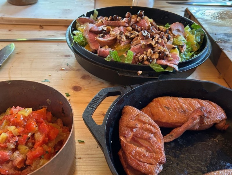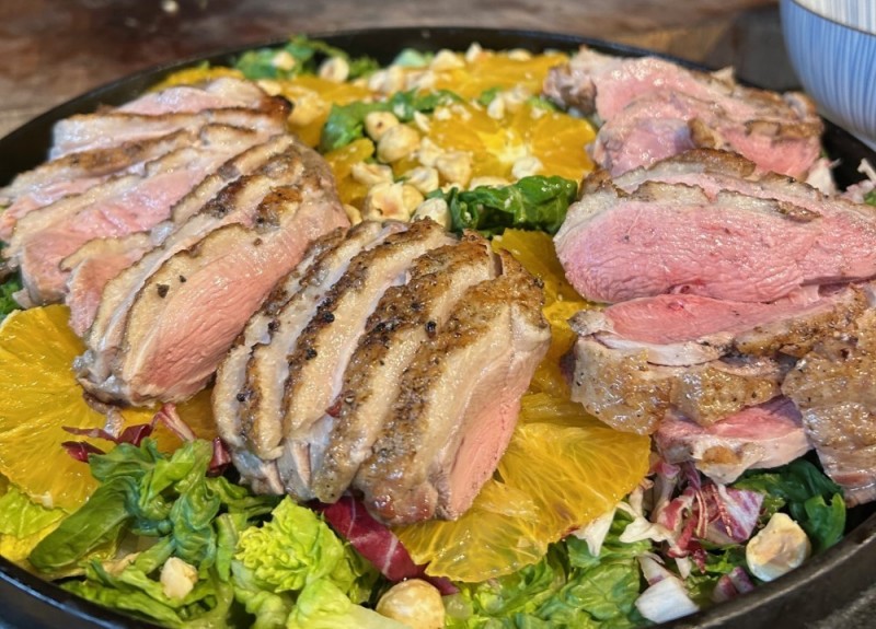 - V roztopeném grilu necháme nahřát litinovou pánev, do které následně vložíme kachní prsa kůží dolu